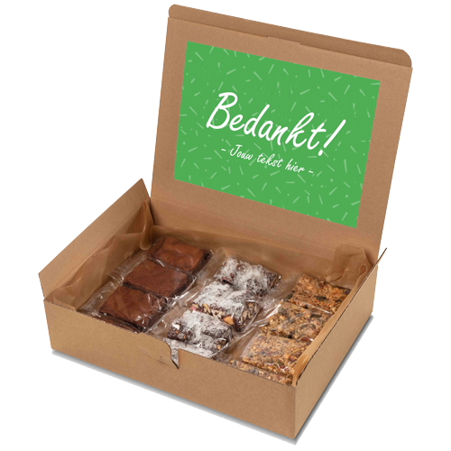 Bestel deze Brownie box "Bedankt!" voor je verjaardagsfeest.